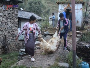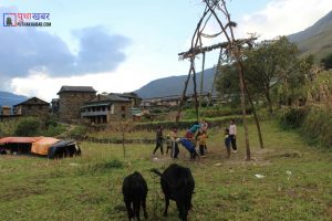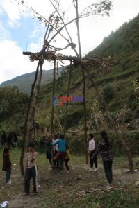 घटस्थापना देखि साताैं दिनमा भाइबन्धुको आहारा स्वरुप प्रत्येक टाेलमा राँङ्गाे काटेर हरेक घर कुरीयाका लागि भाग लगाएर केही मासु आफ्नो टोलमा रहेका अबिवाहित चेलीबेटीहरुका लागि छुट्टाउने गर्छन् । साँझ पख अबिवाहित चेलीबेटीहरु आ-आफ्नो टोलमा जम्मा भएर सो मासु पकाउनलाई जम्मा हुन्छन् । टोल अनुसार भान्जा साइनो पर्ने केटाहरुले चेलीबेटीहरुकाे लागि छुटाएकाे मासु पकाउनलाई तयार गरिदिन्छन् । मासु पकाएर केटाकेटी, युवायुवती सबै सालीभेना साइनो पर्नेहरु संगै बसेर गित गाउँदै रमाइलो गर्छन् । अाठाैं दिनमा पुजापाठ गरेर देवता दर्शन गर्ने पालाे अनुसार खाँडाँ बराजु र बराह थानलाई सिंगार्ने गरिन्छ । युवायुवती जम्मा भएर आफ्नो रितीथिती अनुसार पिङ हाल्न बाबियाे काट्न टोलमा रहेको एउटा कन्या युवतीलाई छानिन्छ । त्यसपछि युवतीले गाउँ छेउमा रहेको खालीबाँङ खाेलाबाट दुबोपाटीको साथ चाेखाे पानी भरि हाँङछेउमा पुगेर बाबियाे बारीमा छर्केर काट्न सुरु गर्छिन् । युवतीले छोएपछि मात्र अन्य युवायुवतीले बाबियाे काटन पाउँछन् । चाेखाे पानी भरेर लगेकाे भेला अचानक खुट्टामा ठेस लागेमा पुनः चाेखाे पानी भरेर लग्ने चलन रहेको छ । केटाहरुले पिङको लागि गित गाउँदै बाबियाेकाे डाेरी तयार गर्छन् । पिङको लागि बाबियाे केटीहरुले काटने र केटाहरुले डोरी भाँड्ने गर्छन् । पिङकाे डोरी भाँड्न गएको युवाहरुलाई युवतीहरुले आफ्नो भागमा पाएकाे राँगोकाे मासु, हड्डी र छालाको माला भनाइ घाँटीमा लगाई दिन्छन् । पिङकाे डोरी तयार भए पछि सबै मिलेर ल्याइ खाँडाँ बराजु थानलाई बेरेर राख्ने गरिन्छ ।